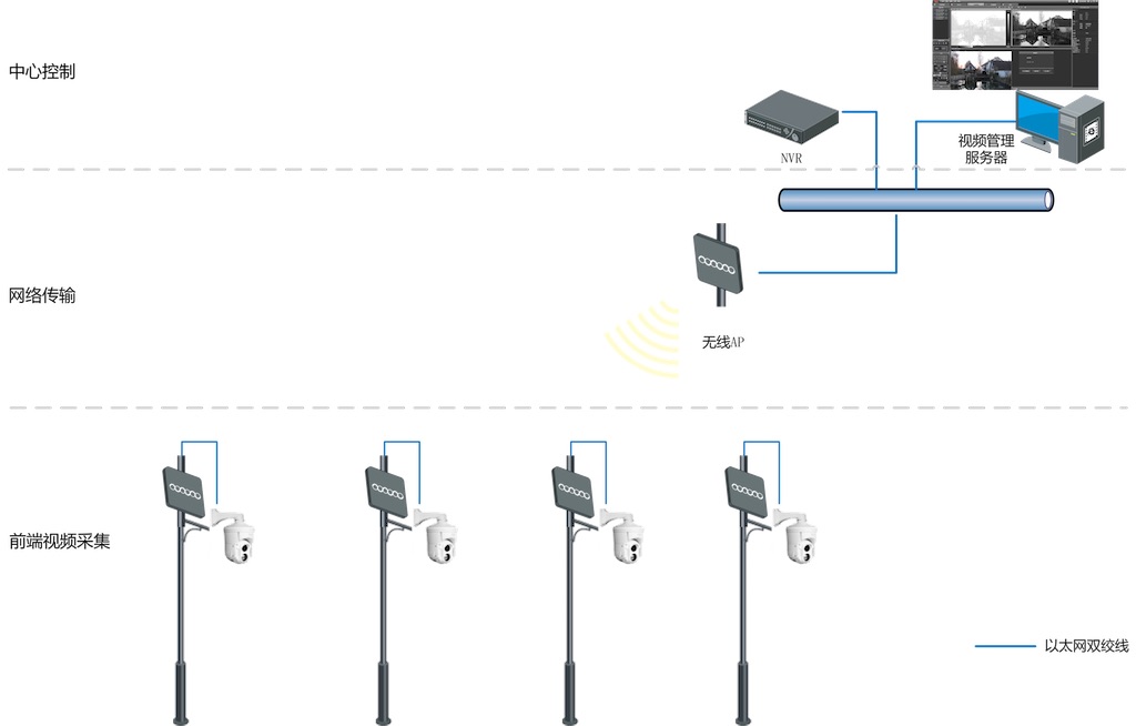 系統由前端雙波段攝像機,網絡傳輸和后端監控室組成。