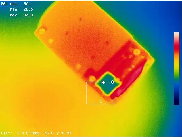 常見(jiàn)的電路板故障一般為短路、斷路或者接觸不良。短路時(shí)電路板電流較正常情況下大,因此對(duì)應(yīng)元件有溫升,其紅外熱像圖較正常情況下有明顯異常;斷路或者接觸不良時(shí),通過(guò)元件的電流值幾乎為零,此時(shí),對(duì)應(yīng)元件的溫度較正常工作時(shí)低,也能夠明顯的顯示在熱像圖中。因此,可根據(jù)以上原理非常方便的判斷出電路板的故障點(diǎn)