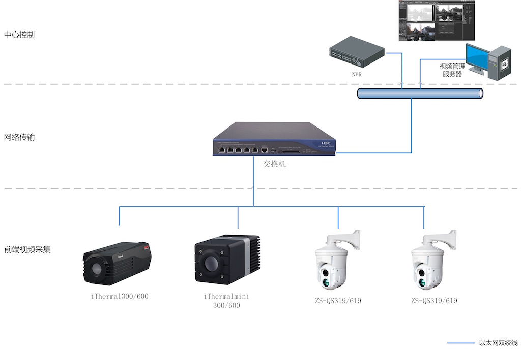 系統由前端雙波段攝像機,網絡傳輸和后端監控室組成。