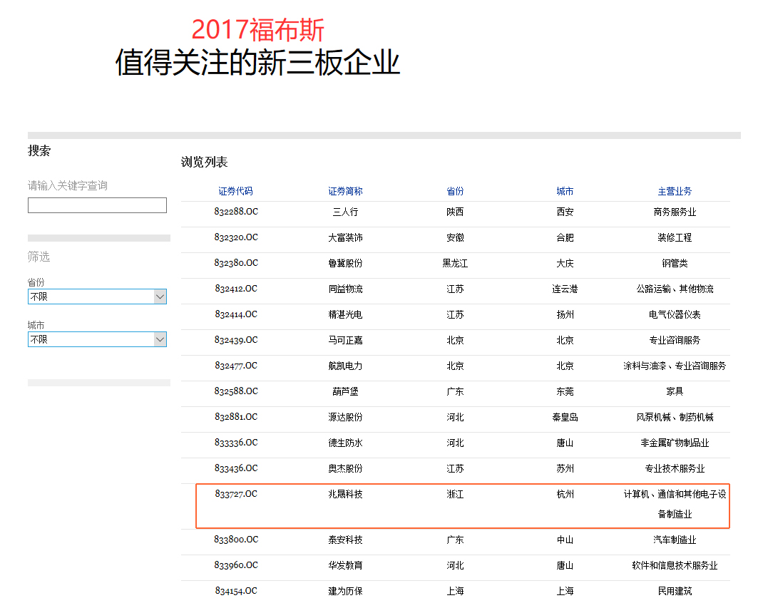 3月20日,福布斯中國發布“2017中國潛力企業榜”。自2005年首次推出“福布斯中國潛力100”以來,至今已走過十二個年頭。福布斯對中國中小企業進行、立調研,并首次分別呈現了上市公司潛力企業榜、非上市公司潛力企業榜和值得關注的新三板企業等三張榜單,共有220家企業榜上有名。其中,新三板潛力企業榜入選的100家企業中,兆晟科技入選其中。